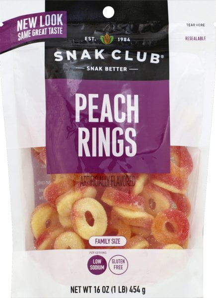 Background. Snak club peach rings are a perfect snack for the whole family. Crafted with low sodium and gluten free, this treat is sure to delight your sweet to enjoy other snak club candy varieties, choose our purple bag!